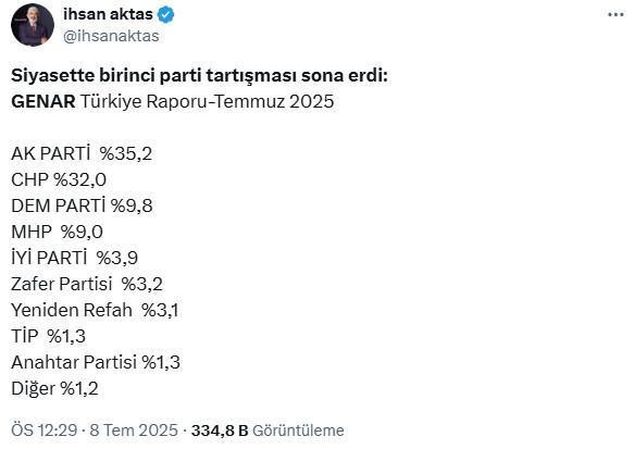 Cumhurbaşkanı Erdoğan ile Özgür Özel arasında “birinci parti” polemiği sürerken, GENAR Araştırma’nın anketinde dikkat çeken sonuçlar yer aldı. Ankette yüzde 35,2 ile AK Parti birinci olurken, CHP’nin oy oranı yüzde 32 olarak ölçüldü.