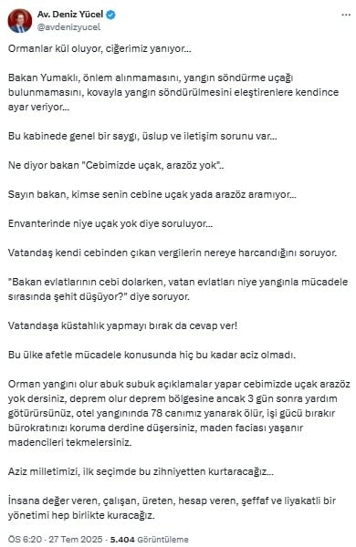 Orman yangınlarıyla ilgili eleştirilere karşı bakanın kullandığı ifadeleri eleştiren Yücel, “Bu ülke afetle mücadelede hiç bu kadar aciz olmamıştı. Vatandaşa küstahlık yapmayı bırak da cevap ver!” dedi.